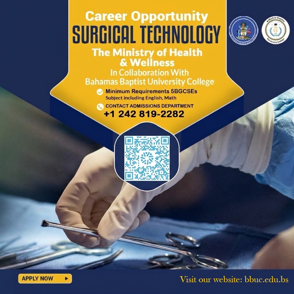 The Associate Degree in Surgical Technology at Bahamas Baptist University College (BBUC) is a dynamic two-year program designed to train students as essential members of the surgical team. Combining foundational knowledge with practical clinical experience, the program prepares students to assist surgeons during procedures by maintaining sterile environments, handling surgical instruments, and ensuring patient safety throughout operations. Students will study anatomy, surgical procedures, medical terminology, and aseptic techniques while gaining hands-on experience in real-world surgical settings. Graduates of the program will be well-equipped to pursue certification and careers in hospitals, outpatient surgery centers, and other healthcare facilities, contributing to the delivery of high-quality surgical care.