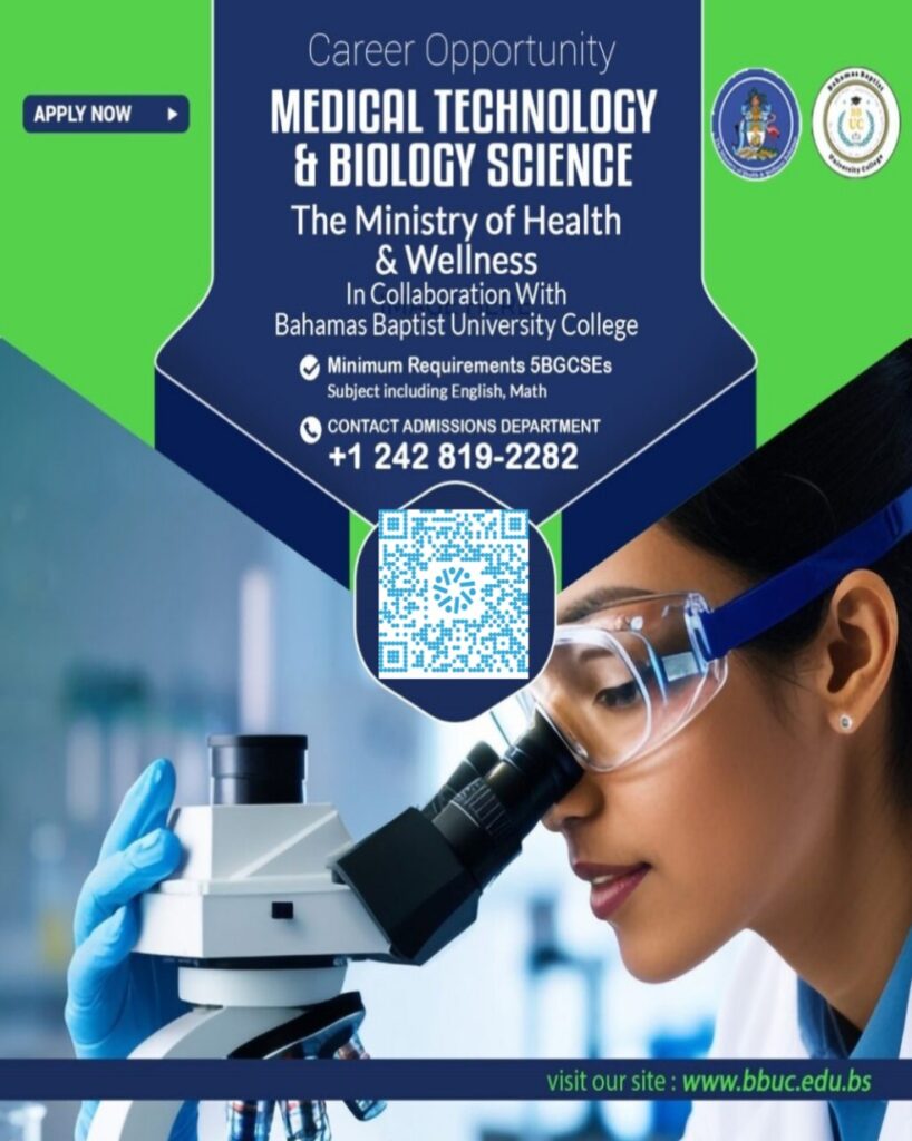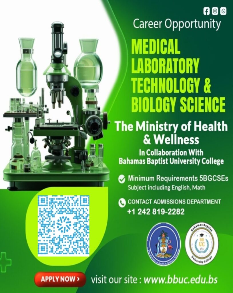 The Associate Degree in Medical Laboratory Technology at Bahamas Baptist University College (BBUC) is a comprehensive two-year program designed to train students in the essential skills of clinical laboratory science. Students gain in-depth knowledge of microbiology, hematology, clinical chemistry, and immunology while mastering laboratory techniques used to analyze biological samples. The program combines rigorous classroom instruction with hands-on laboratory training and clinical rotations, ensuring graduates are well-prepared to perform diagnostic tests that aid in the prevention, diagnosis, and treatment of diseases. Upon completion, graduates are eligible to pursue certification and employment in hospitals, diagnostic laboratories, research facilities, and public health organizations, contributing to the advancement of healthcare through precise and reliable laboratory work.